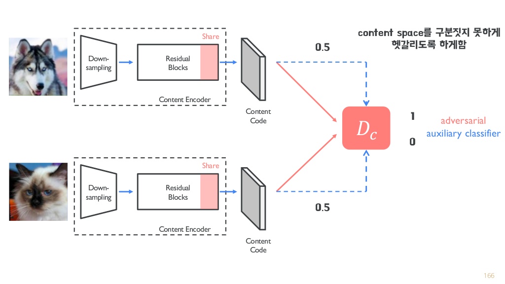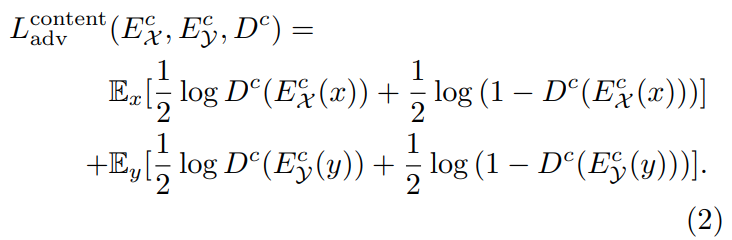 - encoded content features z c x and z c y를 구분할 수 있는 content discriminator Dc 제안.