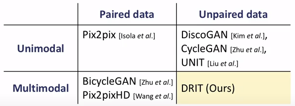 - 이 논문에서는 unpaired training data 조건에서 diverse outputs을 생성하기 위한 방법 제안.