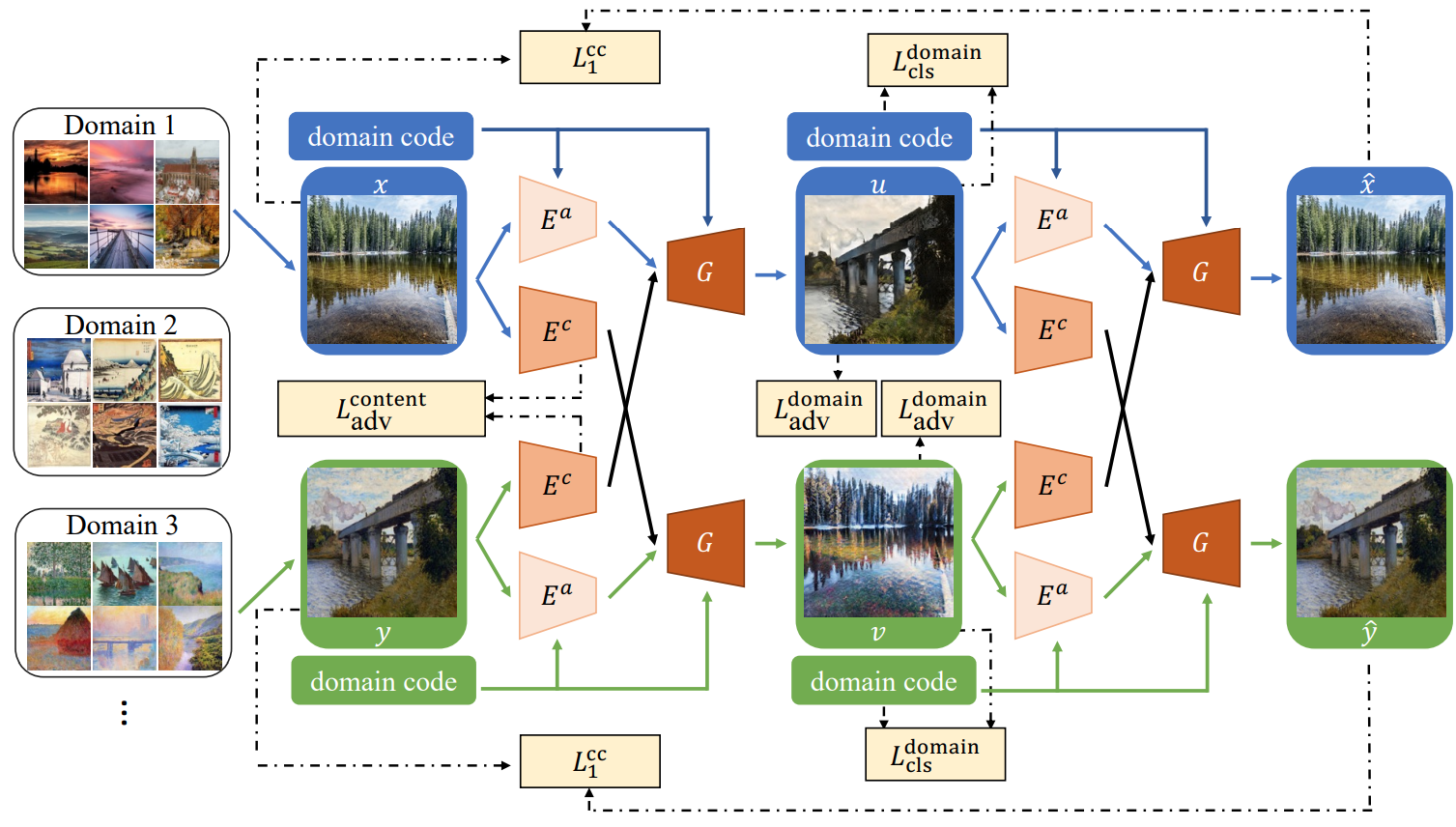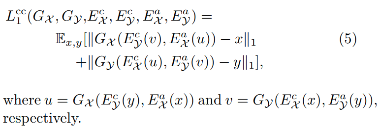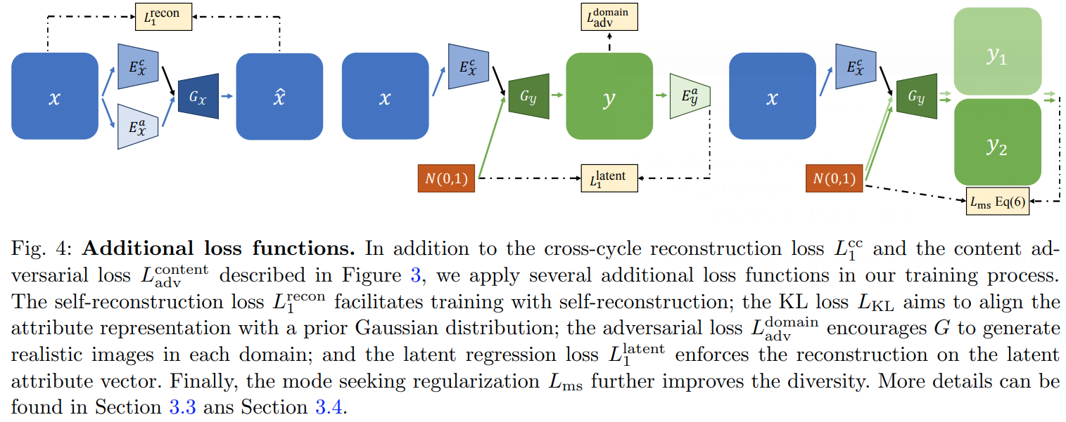 content adversarial loss and cross-cycle consistency loss 외에 Domain adversarial loss, Self-reconstruction loss, Latent regression loss 추가.