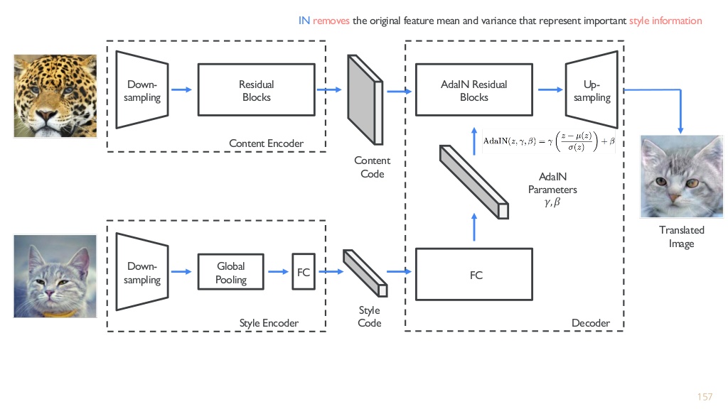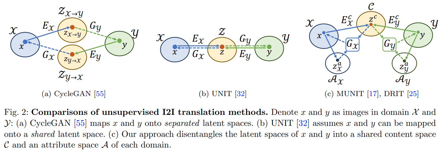 - 아래 그림중 (c)는 MUNIT와 DRIT 에 대한 설명인데 input image를 content와 attribute(style)로 구분해서 embedding 한다는 점에서 유사.