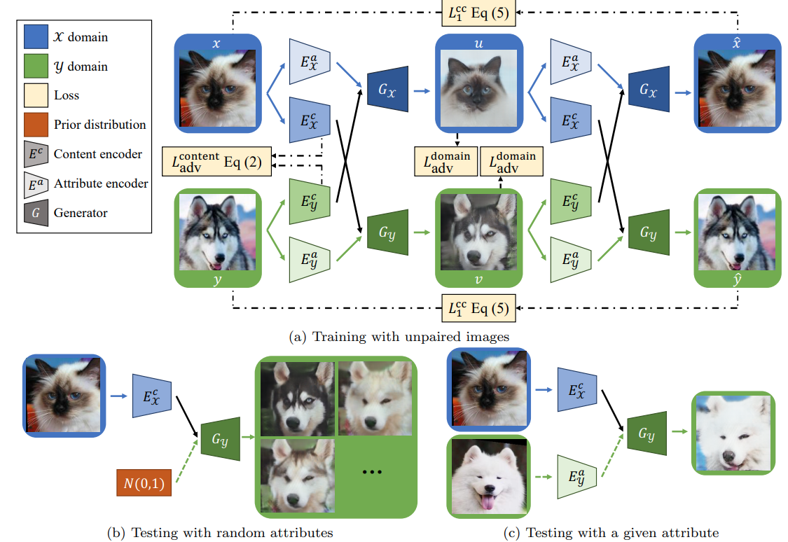 - content encoders는 space C 상에서 도메인 간 공유 가능한 정보를 잘 임베딩 해야 함. 예를 들어 개/고양이 domain 사이에 자세, 표정 등은 공유 가능 함. 하지만 코나, 눈의 생김새, 고양이 수염 등은 omain-specific attribute spaces로 임베딩 되어야 함.